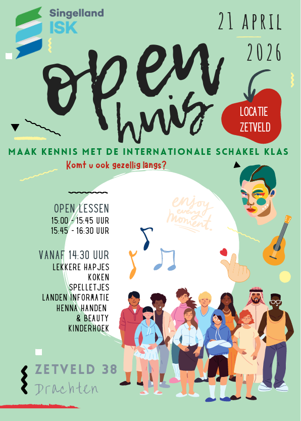 Dinsdag 21 april is het open huis op de ISK. De deuren zijn vanaf 14:30 uur open om een kijkje te nemen in de school. De leerlingen ontvangen u en geven een rondleiding door de school. Er zijn verschillende activiteiten in de school en op het plein. Om 17:30 uur sluiten we de deuren. Iedereen is van harte welkom! Kom langs met ouders, familie, nidos-voogden en coa-mentoren. Neem je kinderen ook gezellig mee! > ISK Zetveld 38 in Drachten.