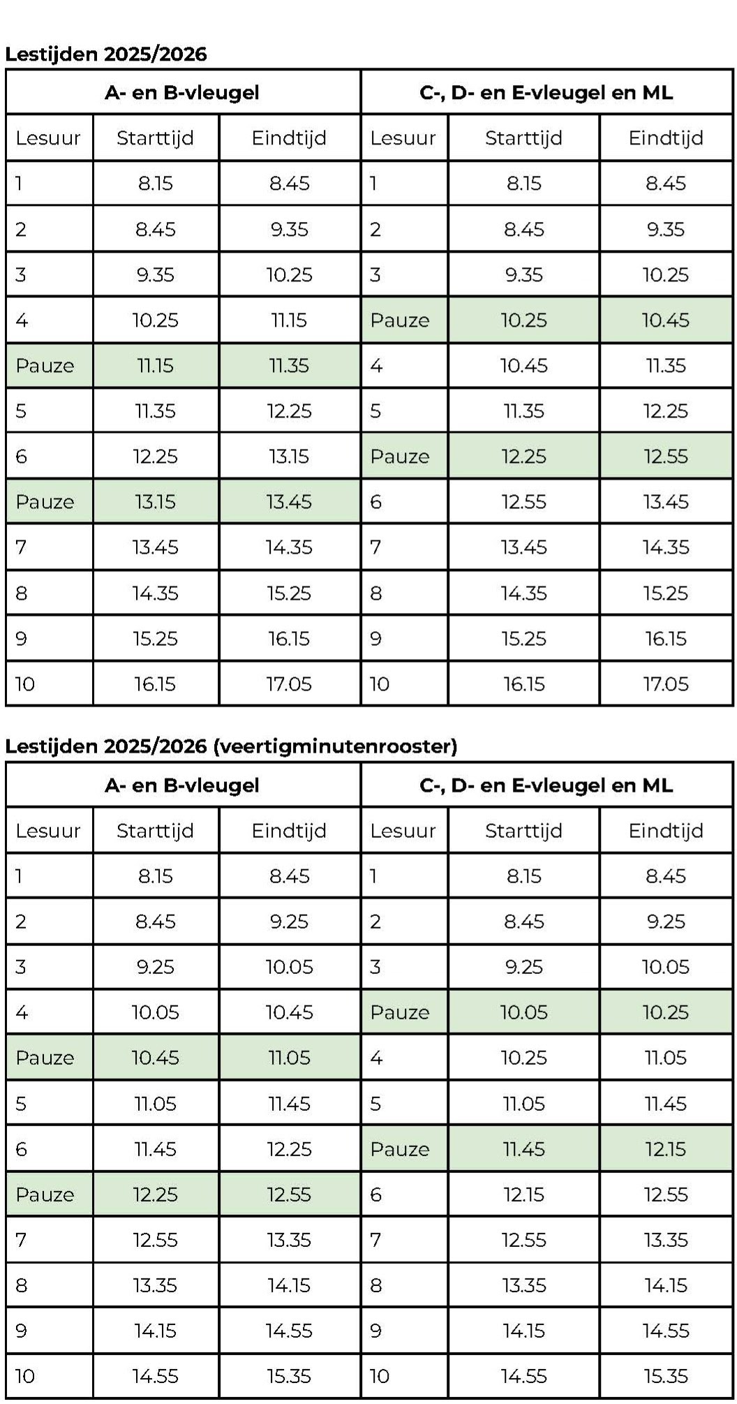 Elke schooldag start om 08.15 uur en eindigt om 16.15 uur. Het lesrooster en overige activiteiten bepalen de invulling van de dag. Dit kan dus naast lessen ook steunlessen, excursies, inhaaltoetsen en disciplinaire maatregelen betreffen. Leerlingen moeten er dus rekening mee houden dat ze pas na 16.15 uur afspraken maken/verplichtingen aangaan, dit om problemen te voorkomen.Verzuim