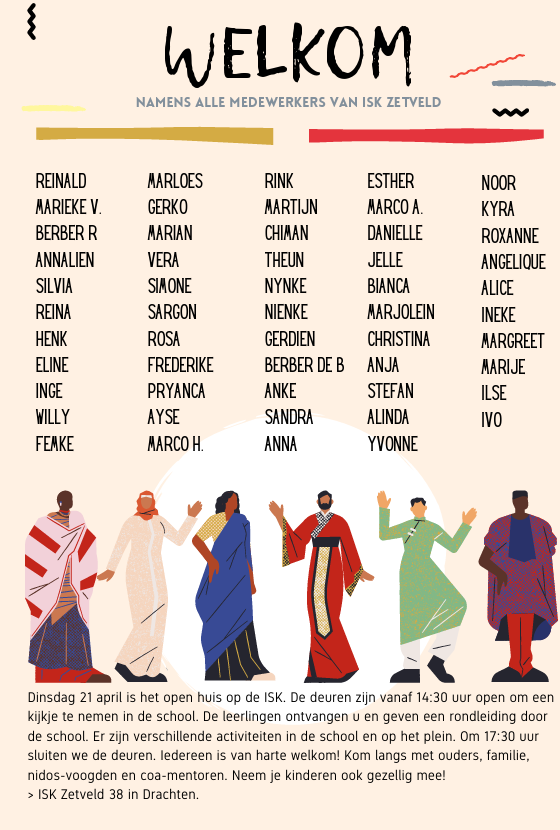 Dinsdag 21 april is het open huis op de ISK. De deuren zijn vanaf 14:30 uur open om een kijkje te nemen in de school. De leerlingen ontvangen u en geven een rondleiding door de school. Er zijn verschillende activiteiten in de school en op het plein. Om 17:30 uur sluiten we de deuren. Iedereen is van harte welkom! Kom langs met ouders, familie, nidos-voogden en coa-mentoren. Neem je kinderen ook gezellig mee! > ISK Zetveld 38 in Drachten.